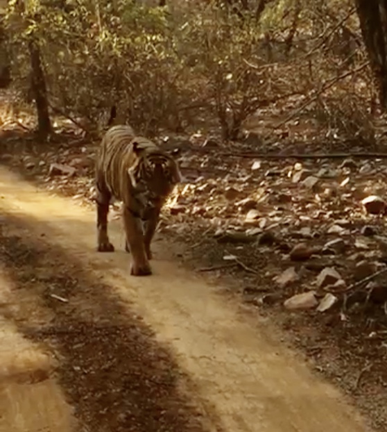 A single Bengal tiger (also called “Royal Tiger”, Panthera tigris tigris) walking on a road in the green jungle. In the background a car with tourists and photographers is visible. The Bengal Tiger is critical endangered, the total population was estimated in 2011 at fewer than 2,500 individuals with a decreasing trend. RANTHAMBHOR